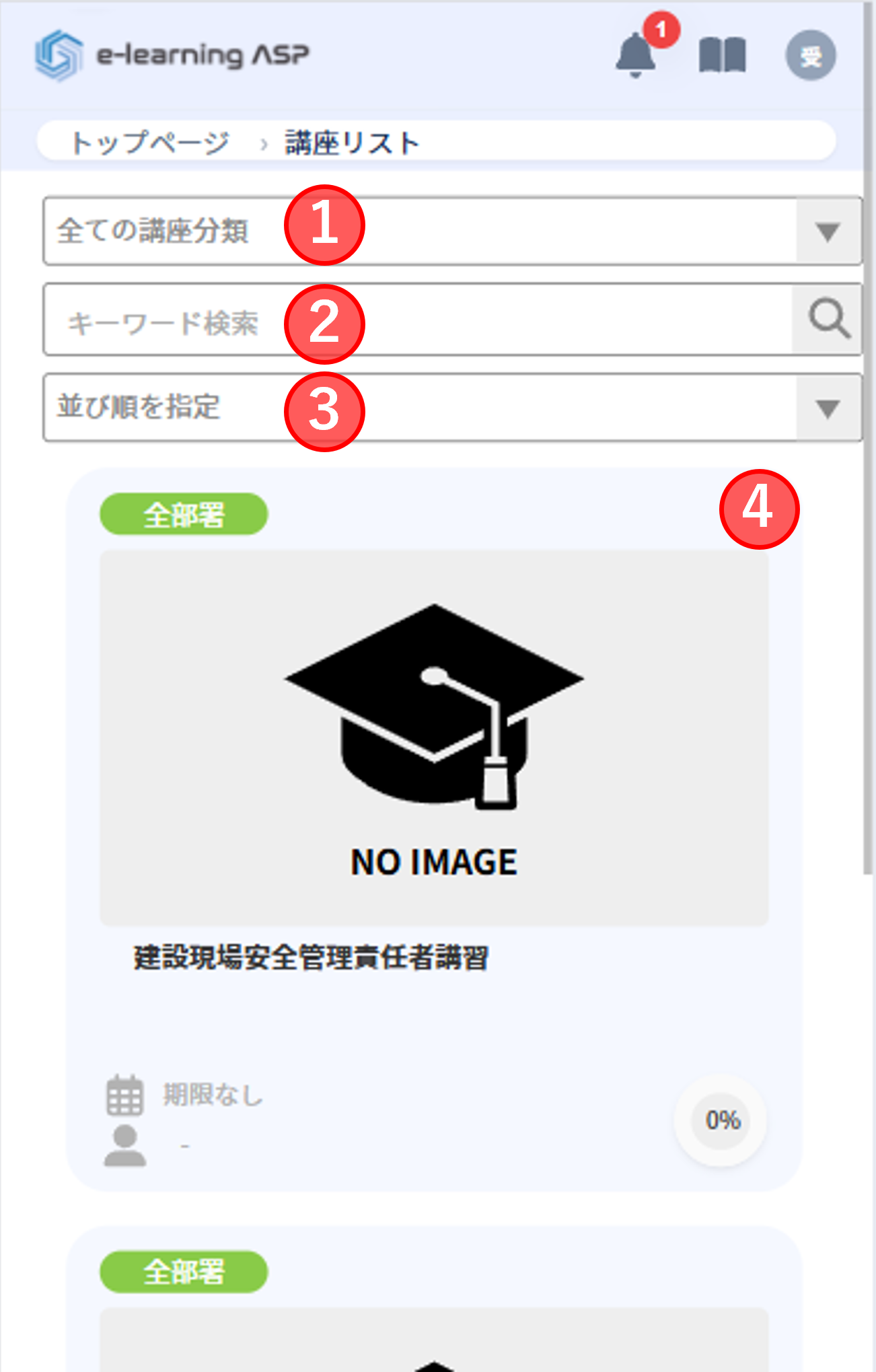 1 | 講座の分類(カテゴリ)です。表示されているカテゴリを選択すると、カテゴリに所属している講座のみを表示することができます。 |