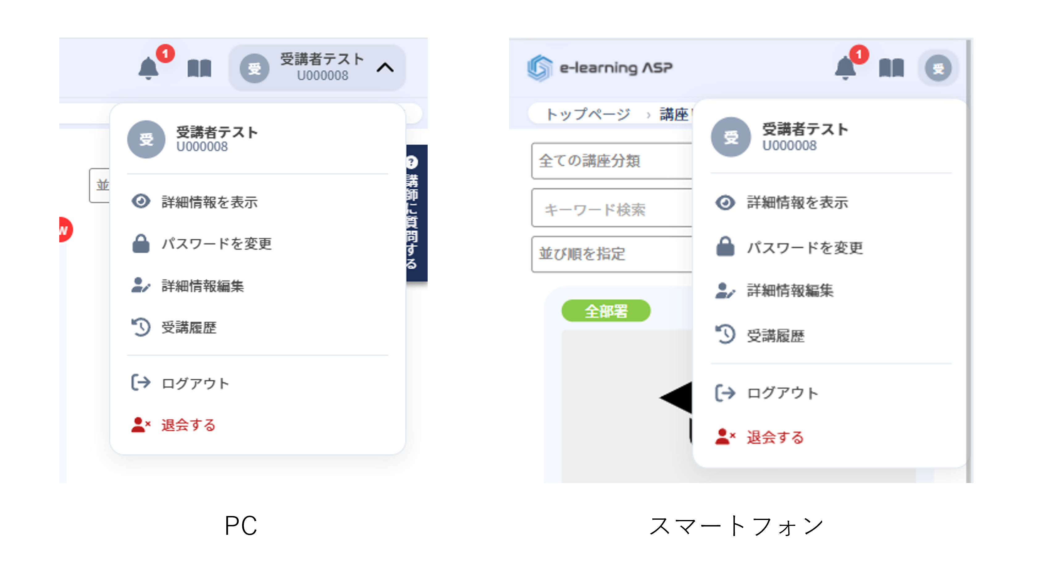 受講履歴を閲覧するためには、サイト右上の受講者メニューを選択し、「受講履歴」を選択してください。※メニューがない場合、履歴の閲覧機能は利用できません。