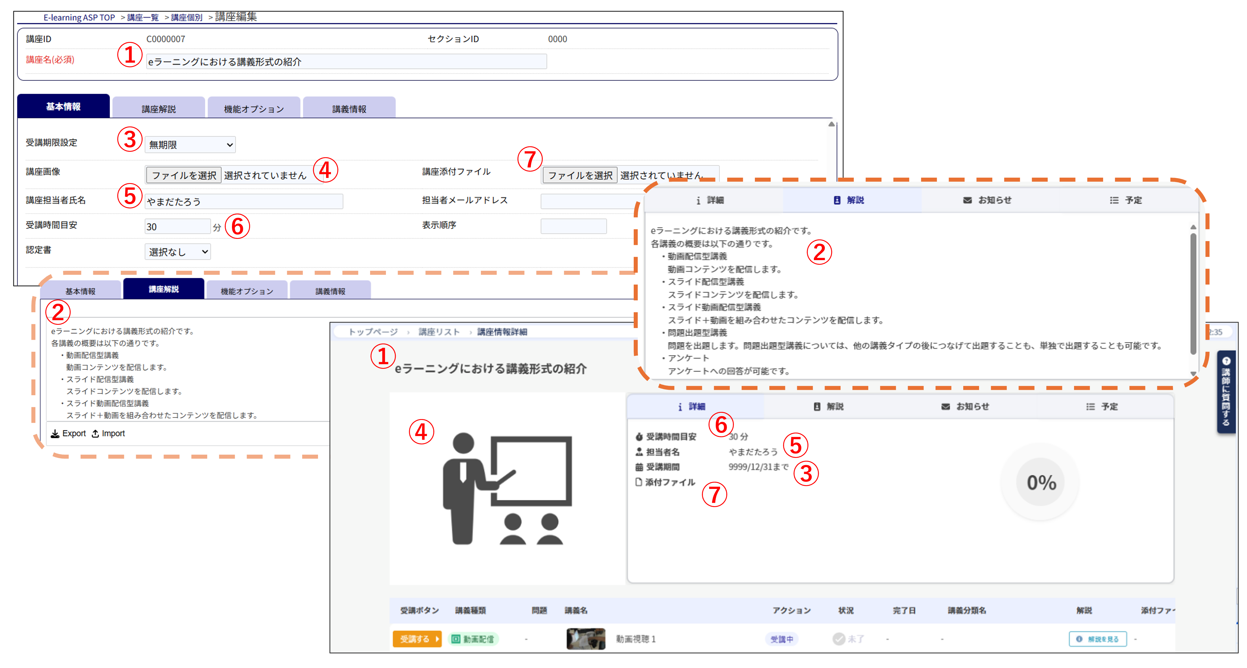 以下が受講者が学習する講座詳細画面と、管理サイトの登録画面との入力項目の対比です。