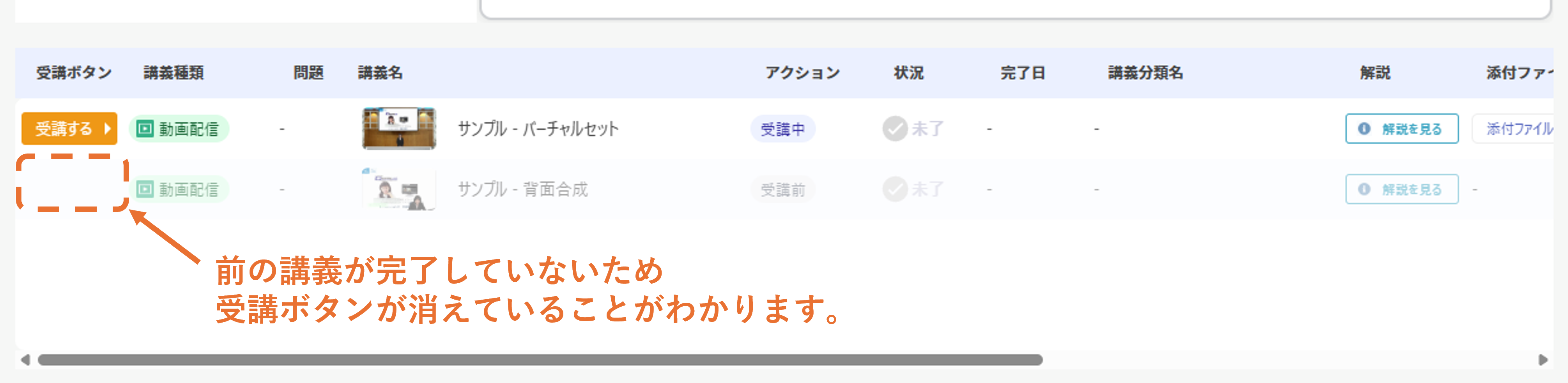 講義を1から順に完了させてほしい場合設定するオプションです。これを設定すると、前の講義が完了するまでは、他の講義は受講できません。
