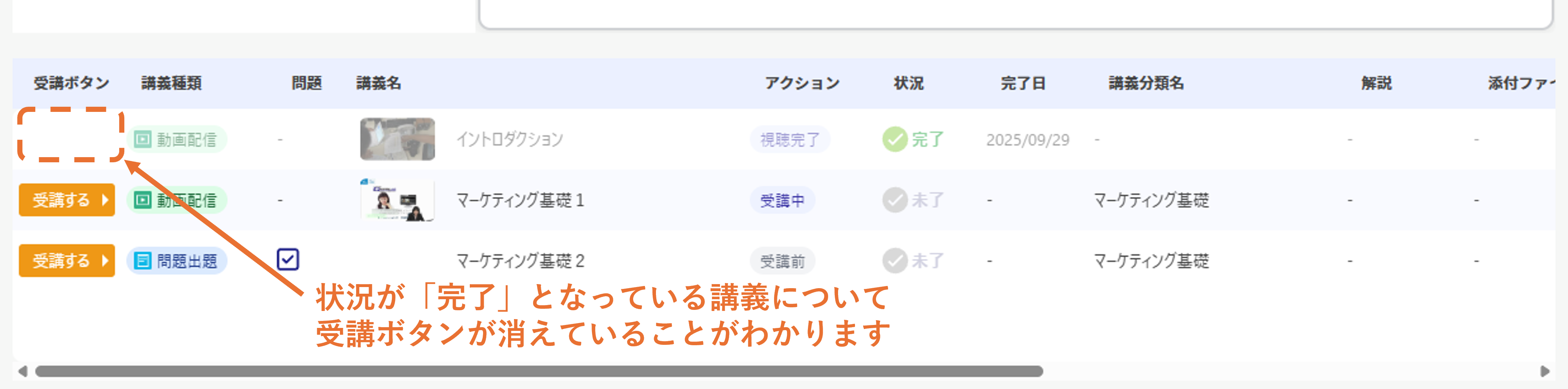 講義の受講完了条件が満たされた場合、その講義は再受講できなくなるという機能です。講義の受講頻度を少なくしたい場合に設定します。