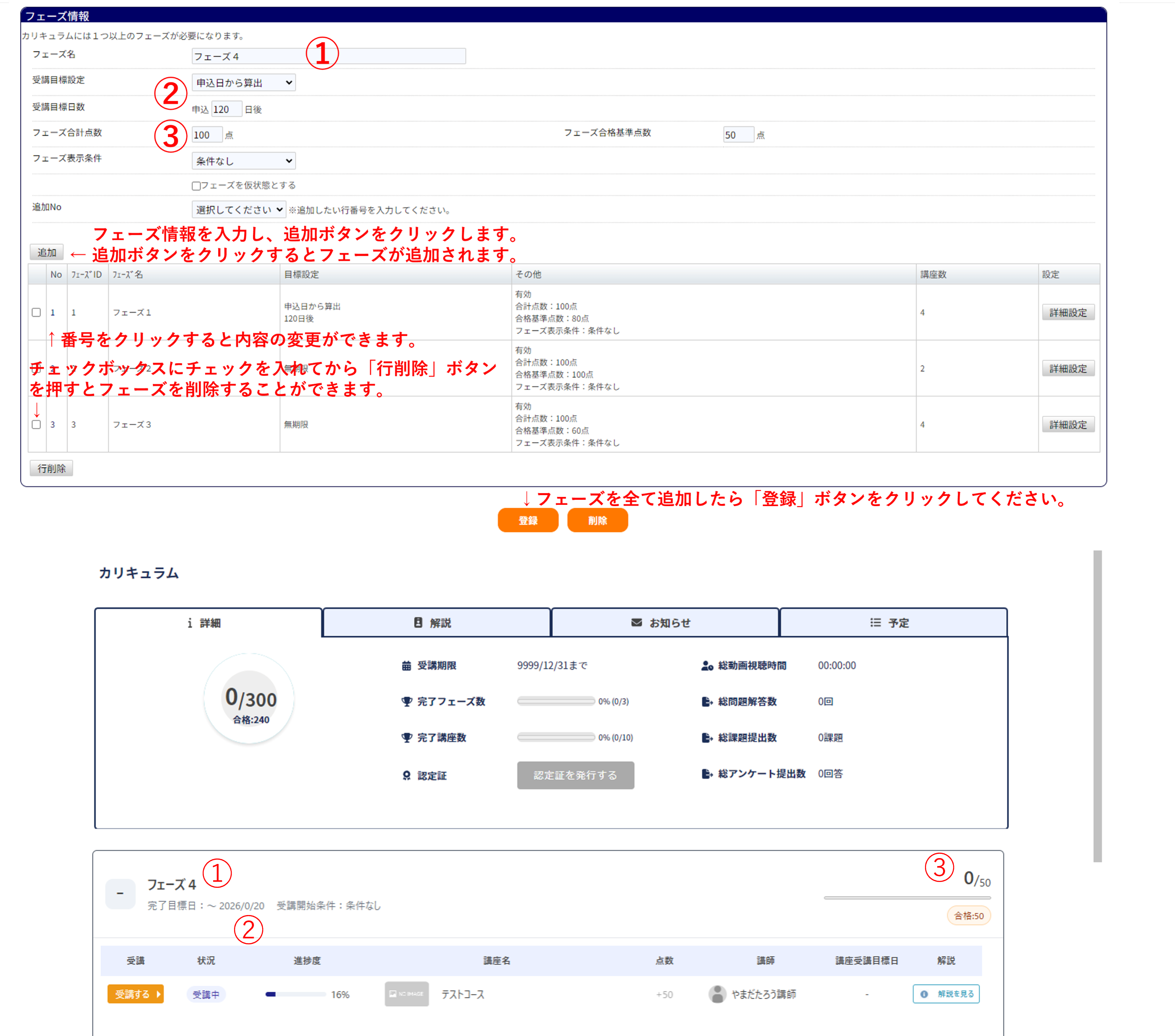 次にフェーズ情報を設定します。カリキュラムには1つ以上のフェーズを設定する必要があります。フェーズの登録方法及び設定項目の詳細は以下図を参照してください。