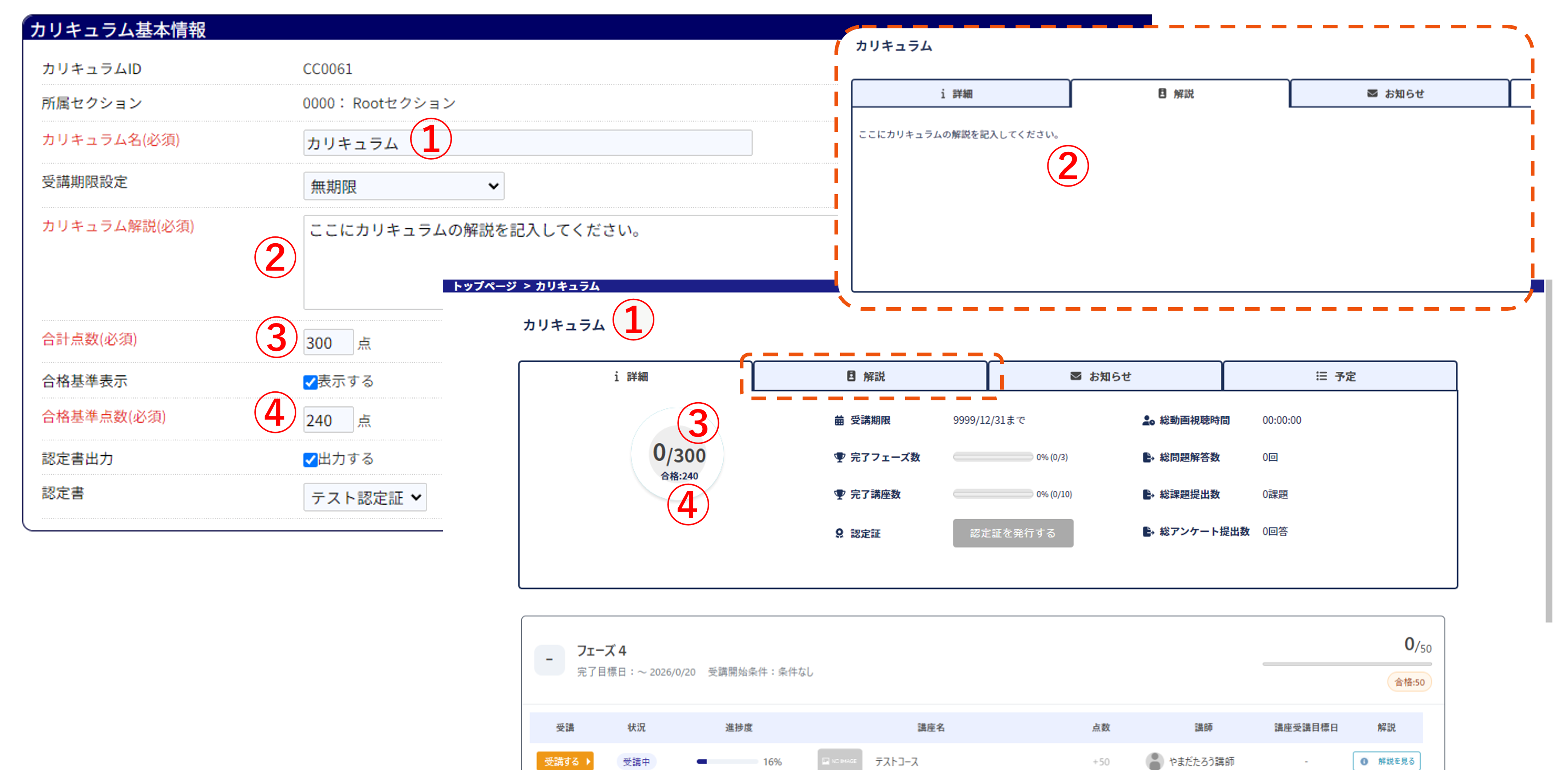 カリキュラムの実際の画面と対応する項目のマッピングは以下の図の通りです。