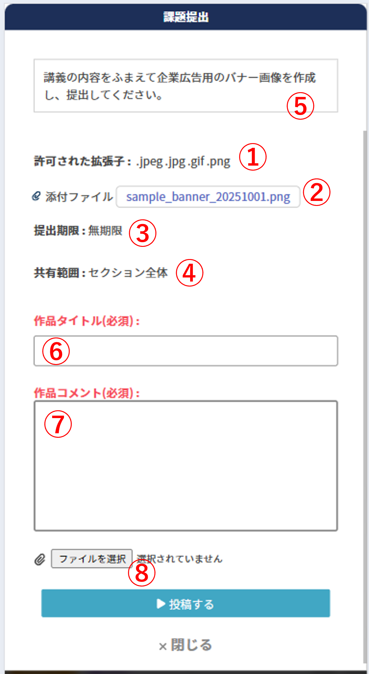 提出を求められている課題の種類(画像、動画・音声、WEBサイト、その他、現物提出の5つ)によって切り替わります。